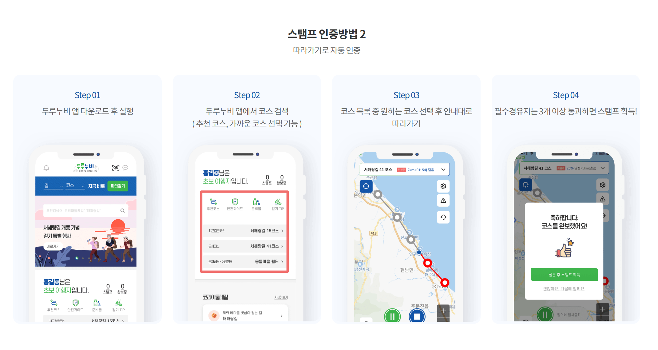 두루누비 혹은 민간 앱 이용 코리아둘레길 각 코스 완보 인증 스탬프를 모두 발급 받으신 분