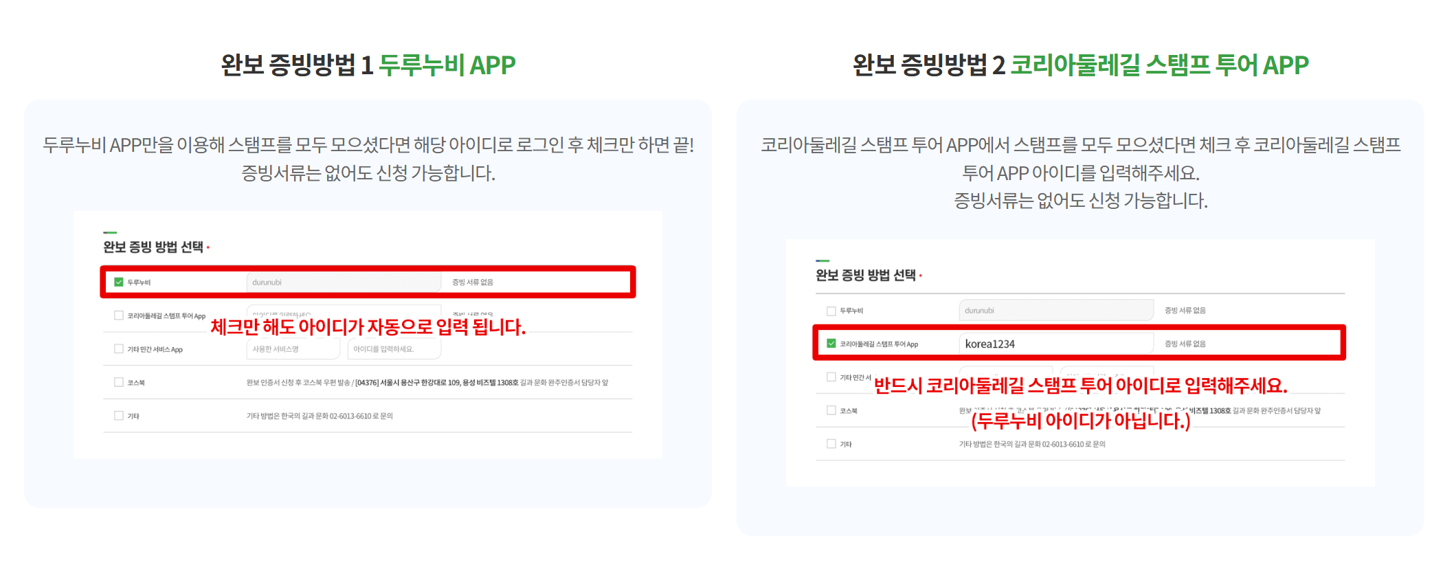 차량 이동 등 부당한 방법으로 스탬프를 확보하신 분에게는 완보인증서 발급에 제한이 있을 수 있음을 알립니다.