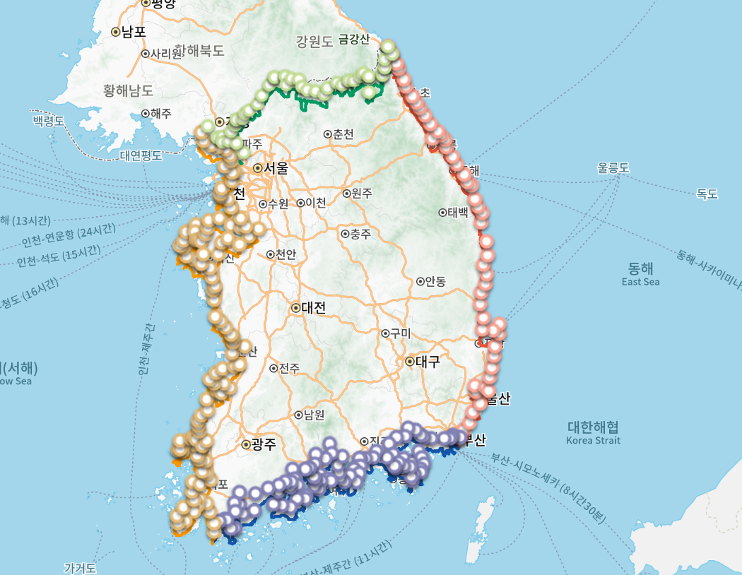 코리아둘레길은 우리나라 국토 외곽을 하나로 연결한 걷기여행길입니다.