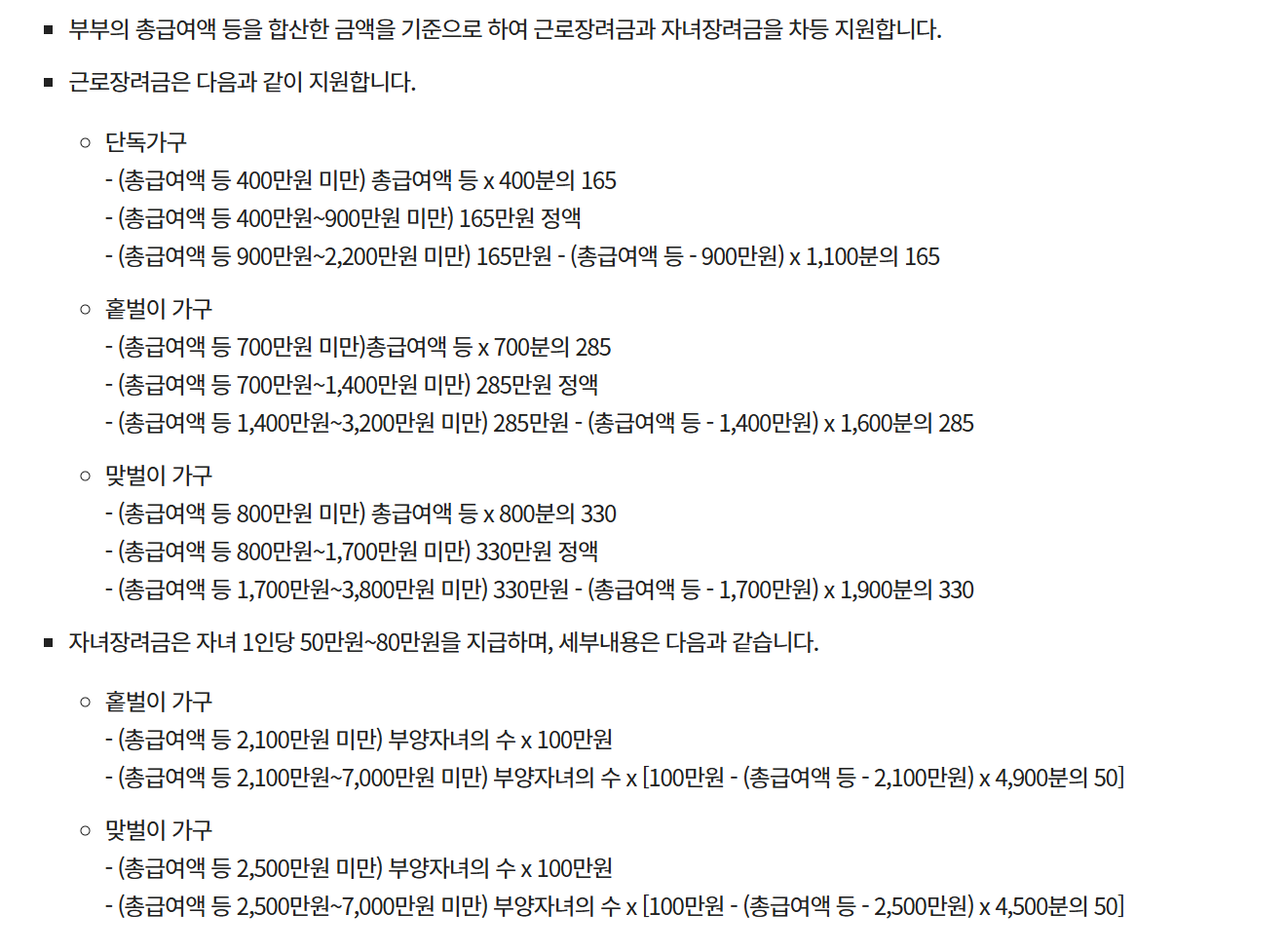 근로소득, 사업소득, 종교인소득이 있는 거주자로서 아래 요건을 갖춘 경우 장려금 신청이 가능합니다.