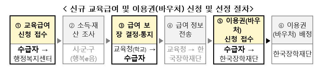 2025년 처음으로 교육급여 지원을 희망하는 보호자(학부모 등)나 학생은 읍·면·동 행정복지센터에 방문하여 신청하거나 해당 누리집*에서 온라인으로 신청이 가능하며, 이후 소득‧재산 조사를 통해 교육급여 수급자로 확정된다.