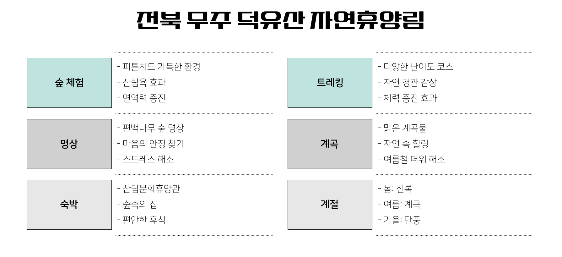 자연 속에서 힐링하고 싶다면 덕유산 자연휴양림이 제격입니다. 맑은 공기를 마시며 걷는 숲길 트레킹은 심신 안정에 큰 도움을 줍니다.
