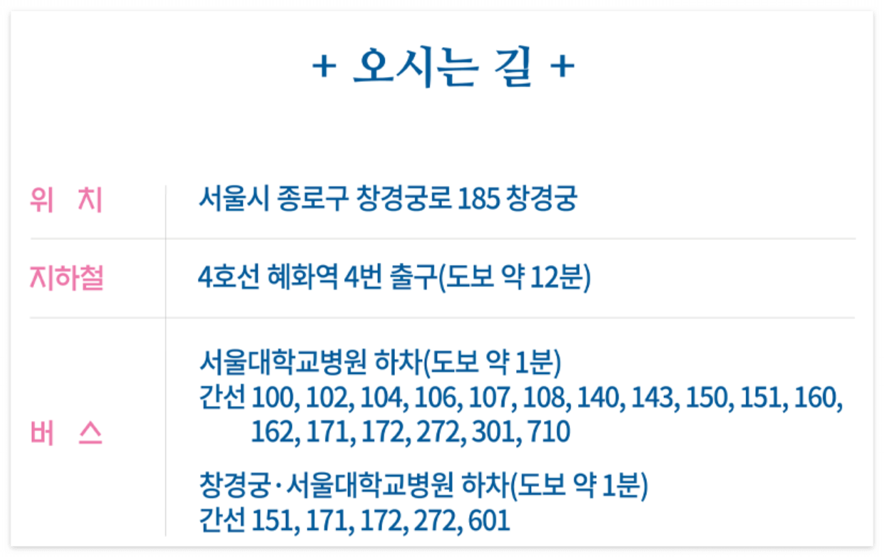 - [창경궁·서울대학교병원 하차(도보 약 1분)] 간선 151, 171, 172, 272, 601