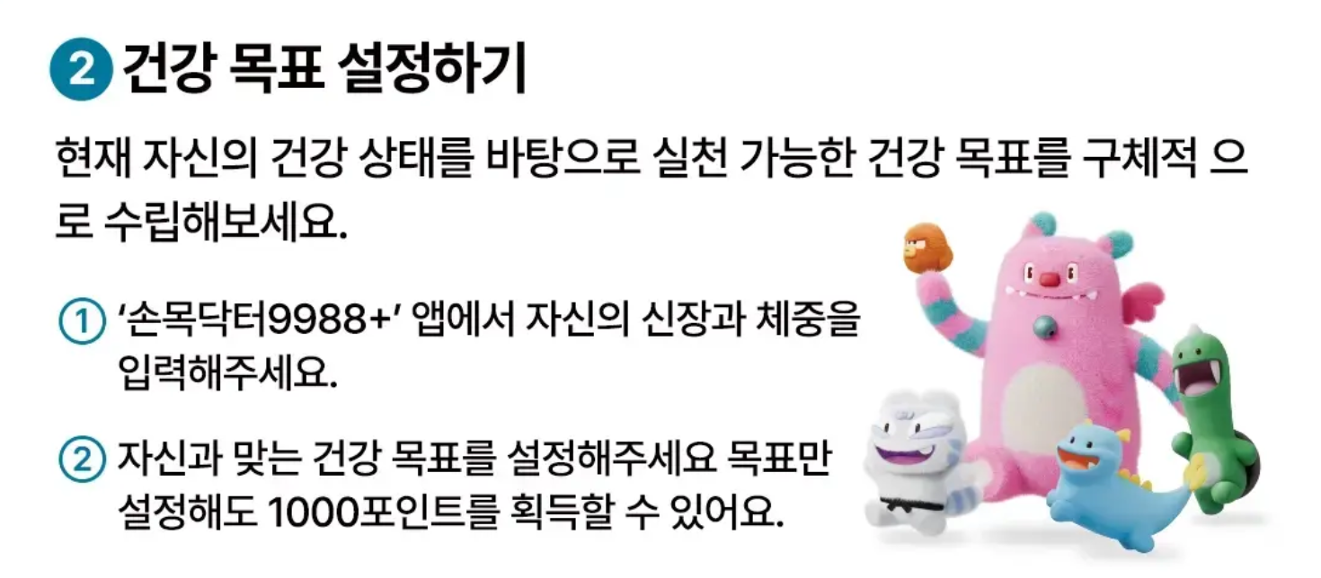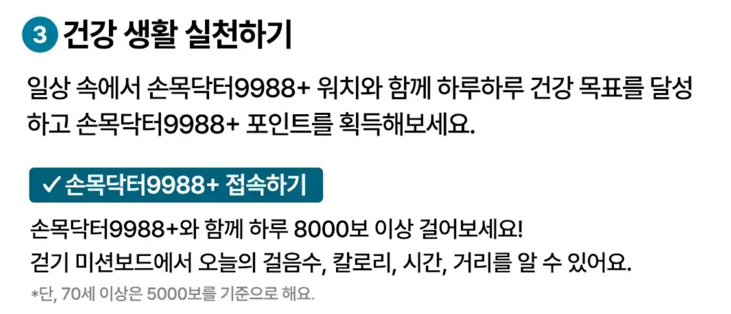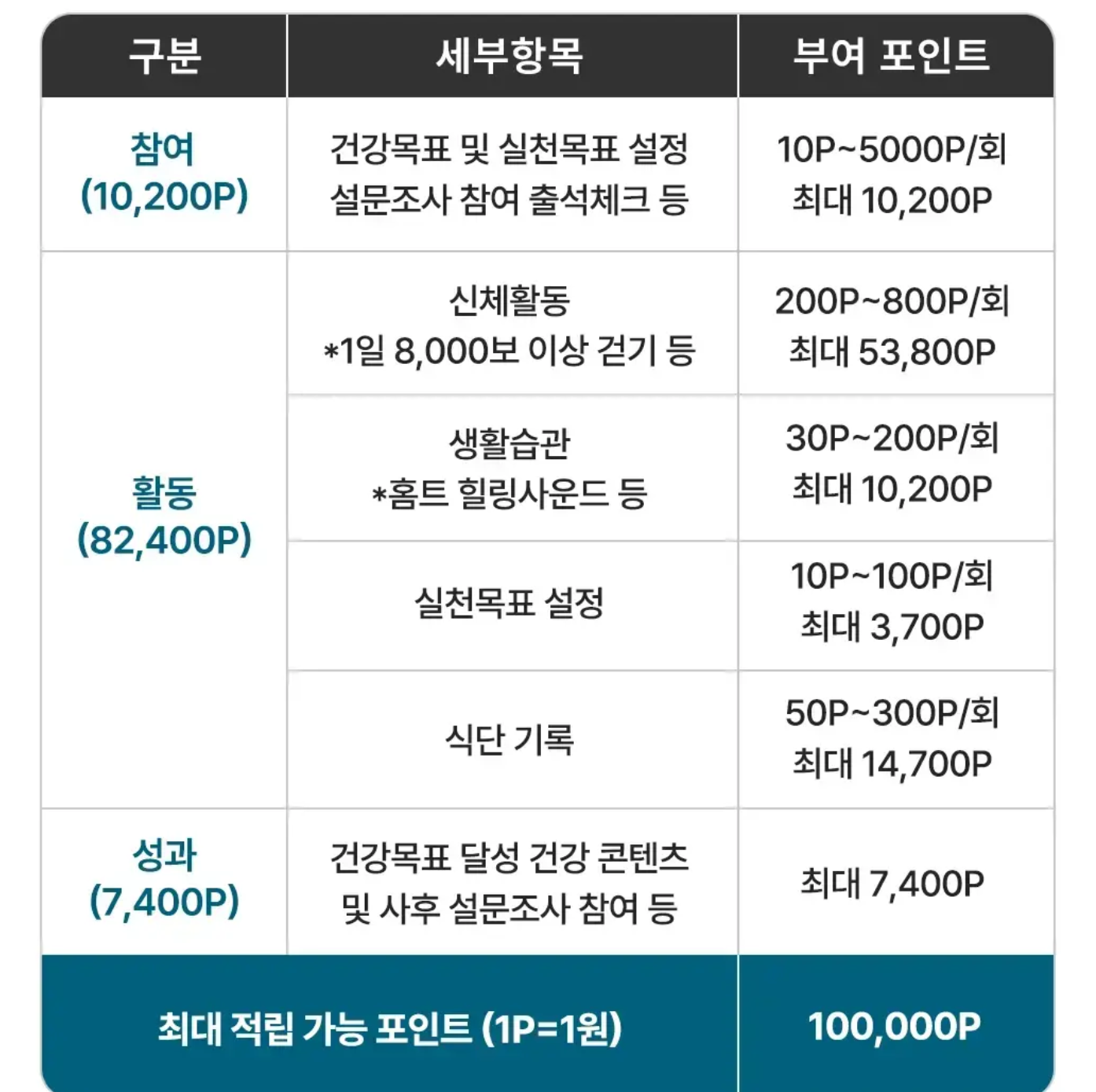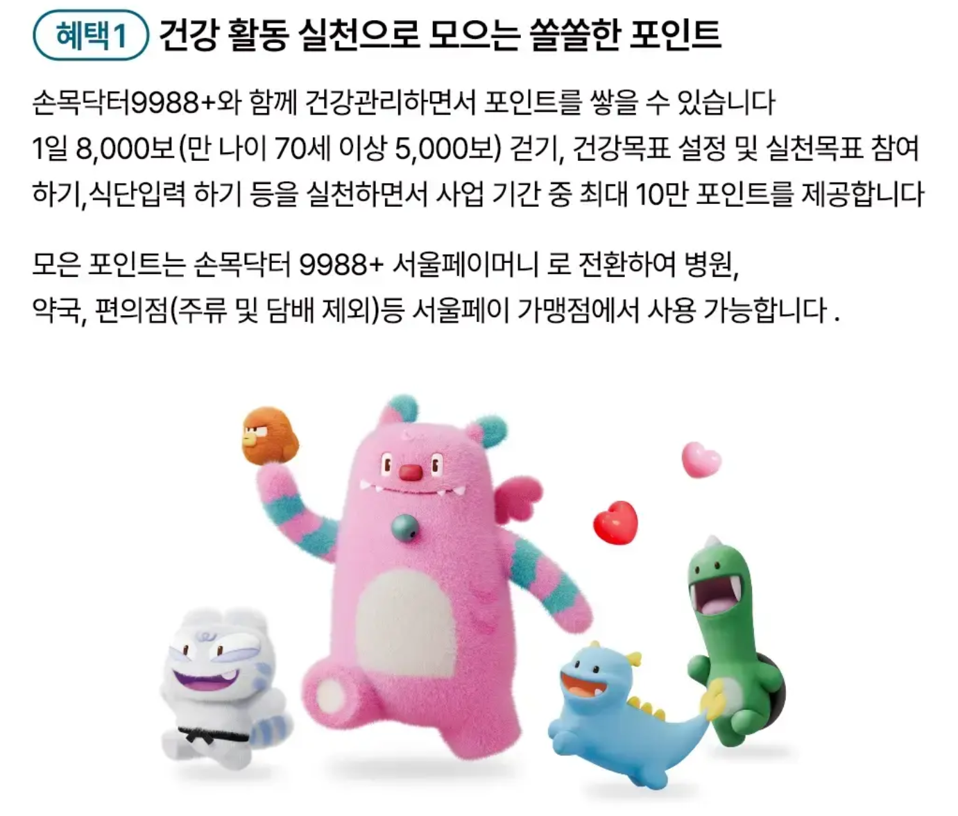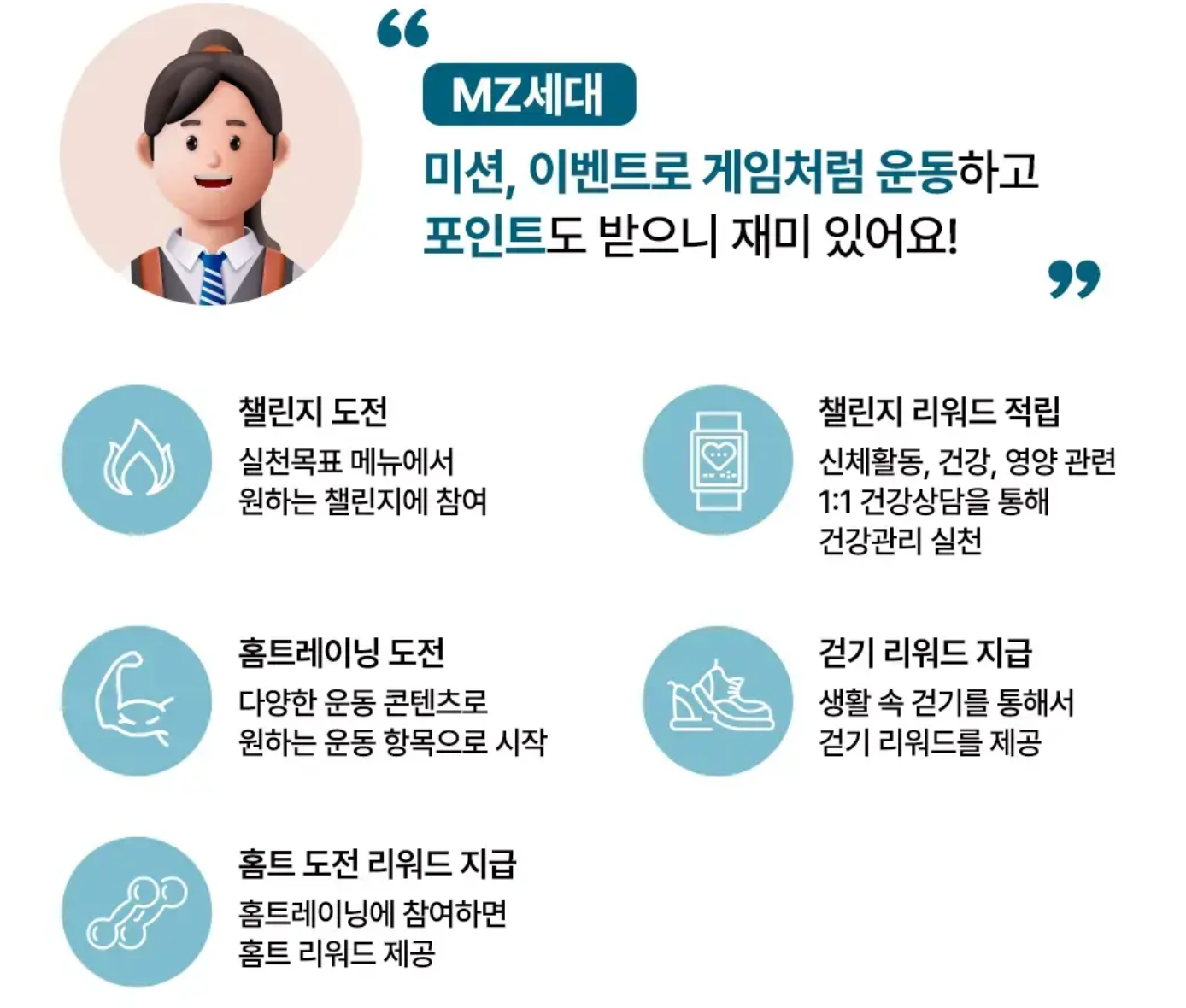 - 인센티브 제공: 일일 8,000보(70세 이상은 5,000보) 걷기 목표 달성 시 포인트를 적립해주며, 최대 10만 포인트까지 적립 가능합니다. 적립된 포인트는 병원, 약국, 헬스장, 안경점, 편의점 등에서 현금처럼 사용할 수 있습니다.
