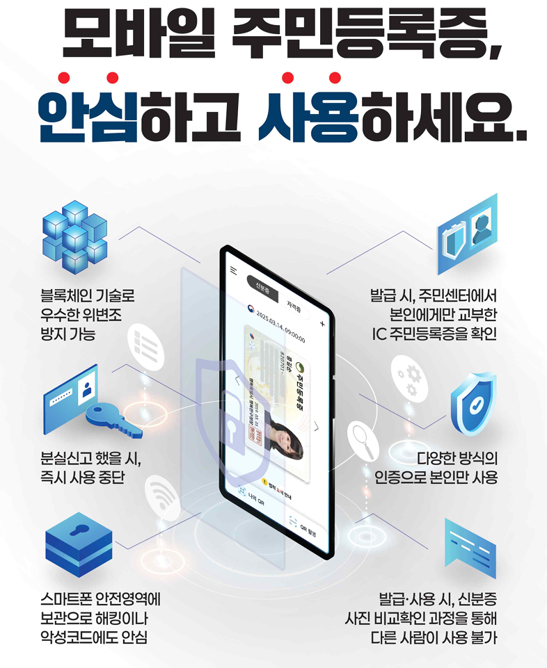 보안·안전성을 확보하기 위해 모바일 주민등록증에는 블록체인, 암호화 등 다양한 보안기술이 적용되었으며,