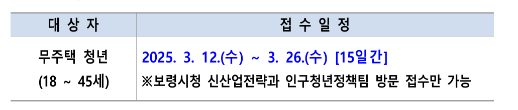 신청은 보령시청 신산업전략과 인구청년정책팀 방문접수로 가능하며, 신청 기간은 3월 12일부터 26일까지입니다.