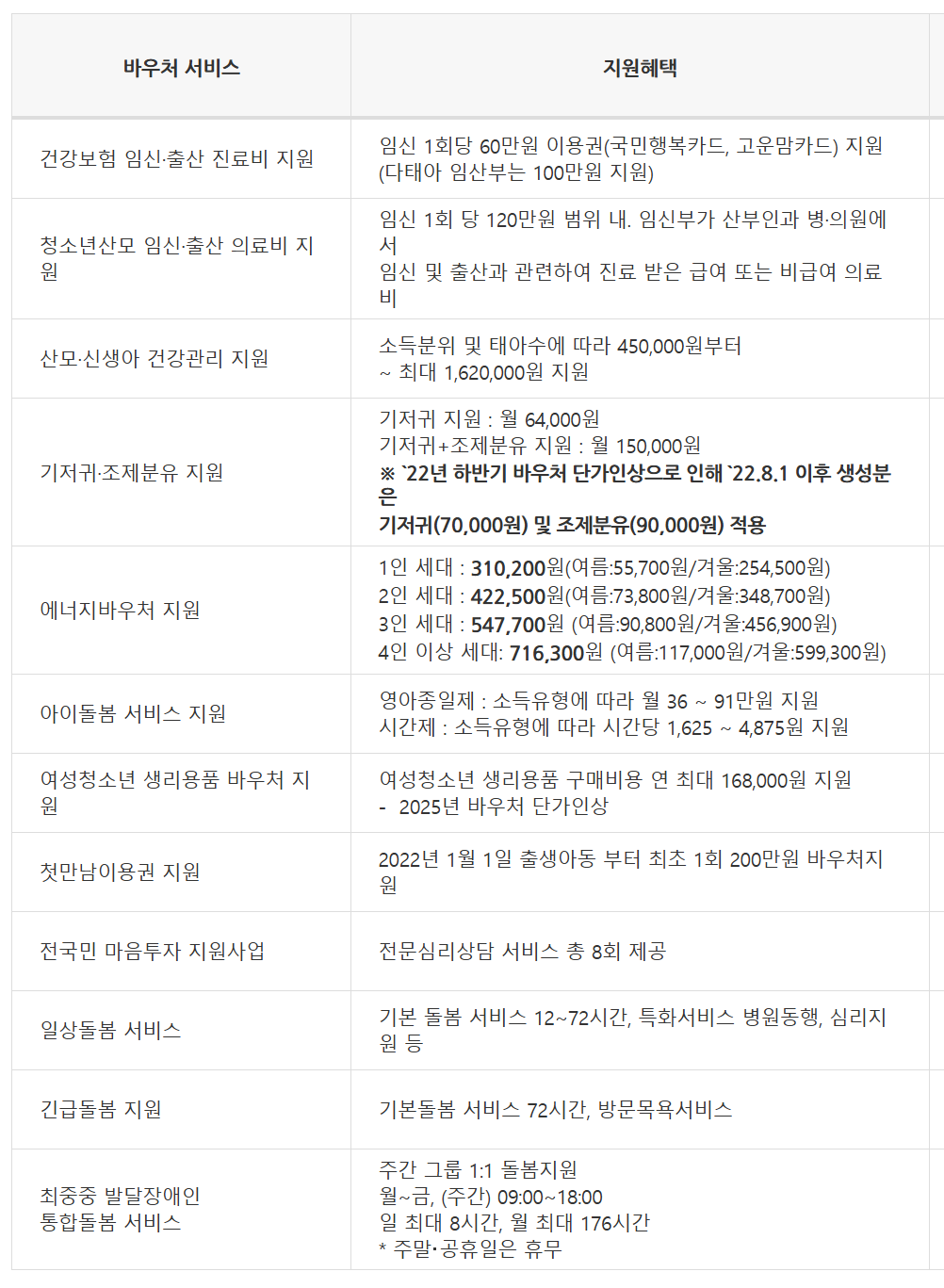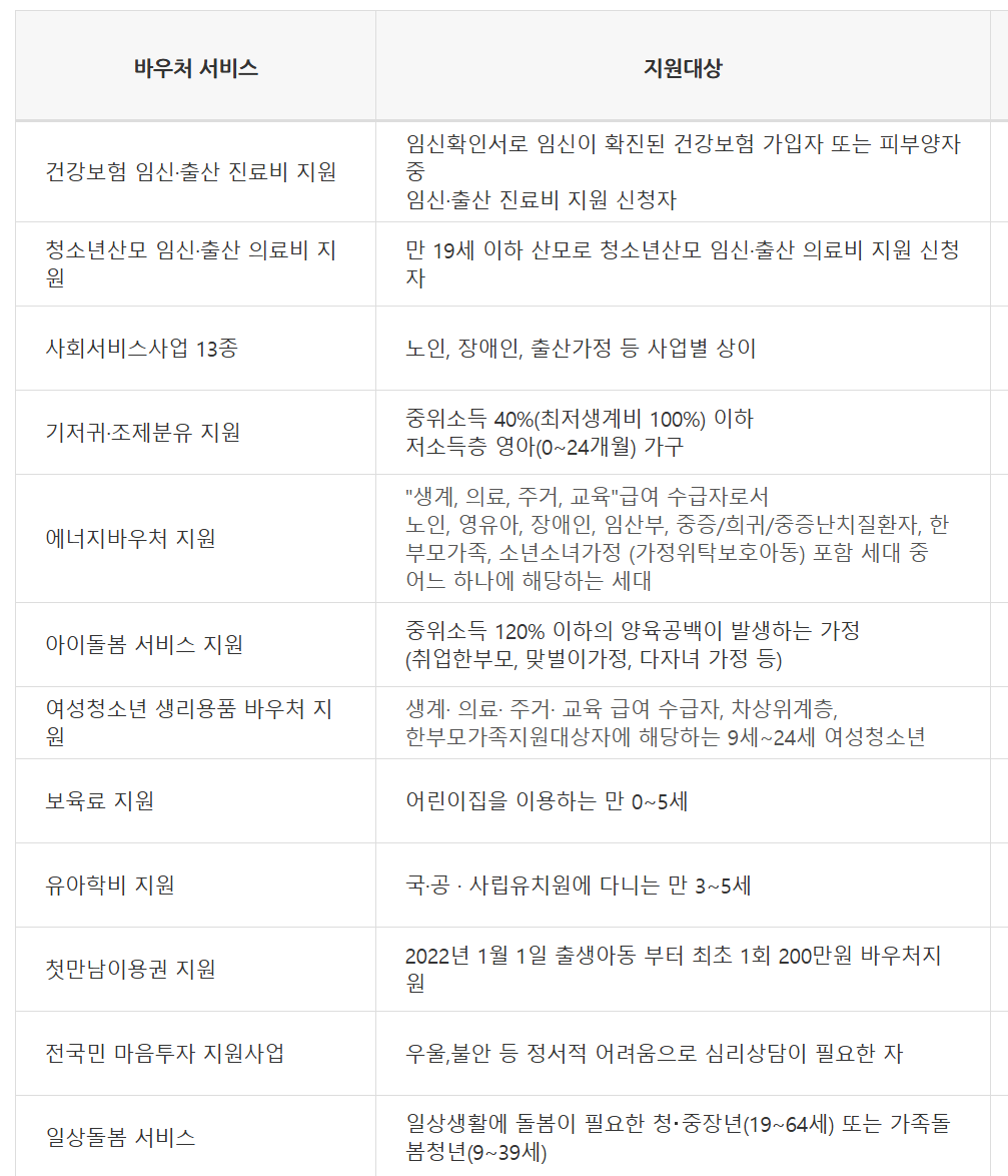 - 바우처 금액: 출산형태(단태아/쌍둥이), 소득 기준에 따라 다름