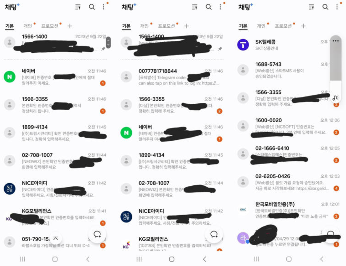 인증 번호를 요청한 사이트는 포털사이트 네이버, 중고 거래 플랫폼 당근, 게임사 NCSOFT·네오위즈 등이었고 결제 및 인증 서비스를 제공하는 드림시큐리티, NICE아이디, KG모빌리언스, 다날, 한국모바일인증에서도 인증 번호가 연이어 왔다.