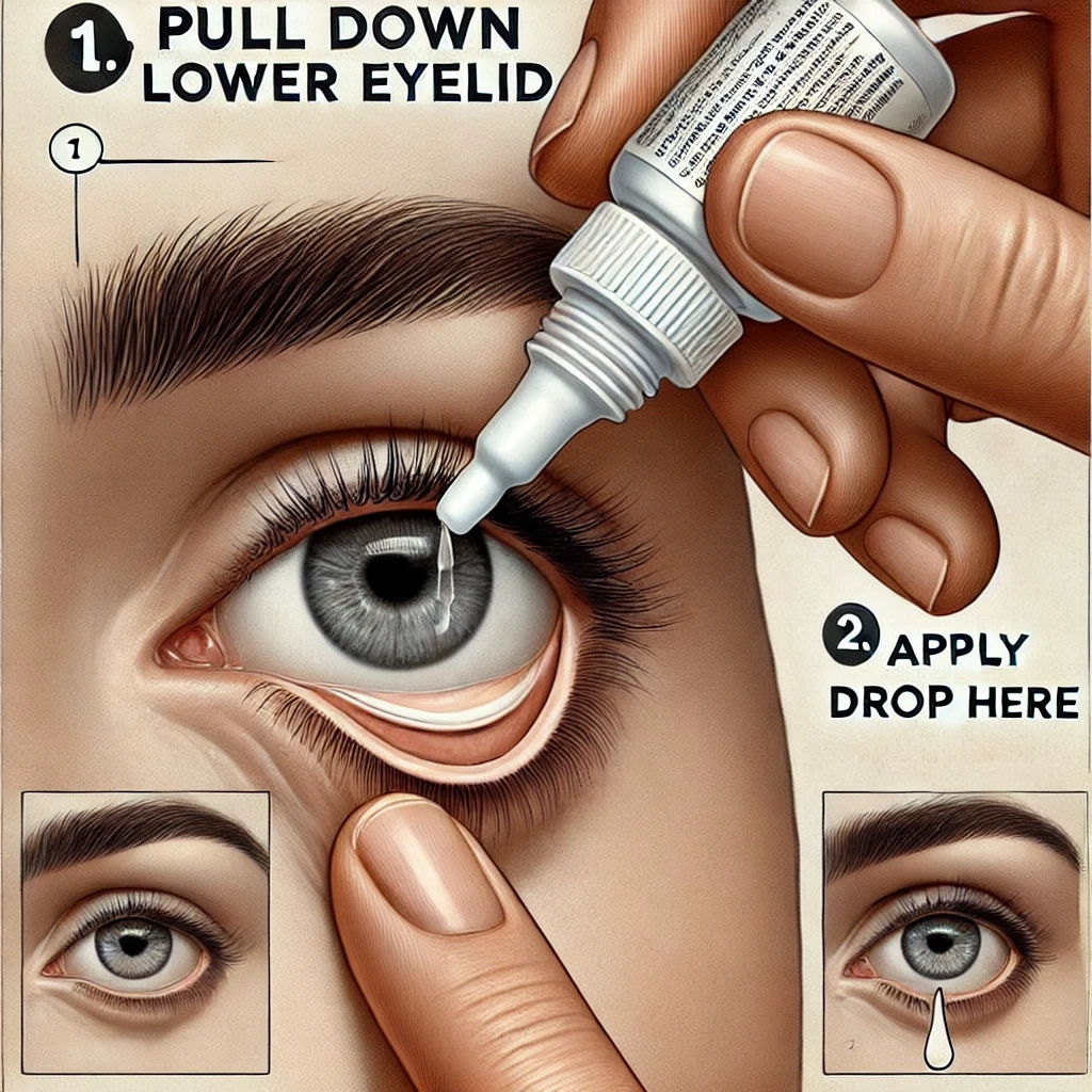 - 고개를 약간 뒤로 젖히고, 한 손으로 아래 눈꺼풀을 살짝 아래로 당깁니다.