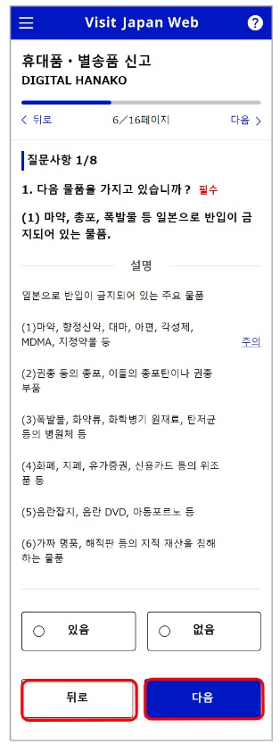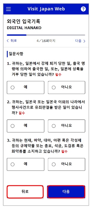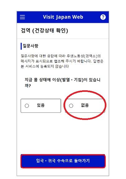 √ 검역(건강상태 확인)에서 지금 몸 상태에 이상이 있습니까? 를 선택 후