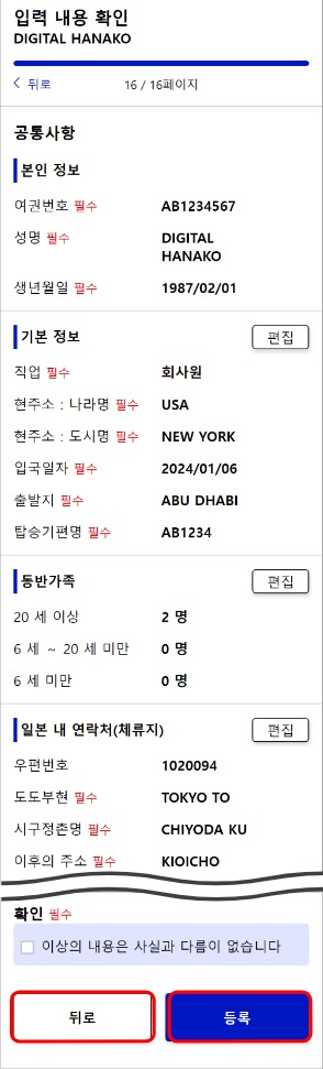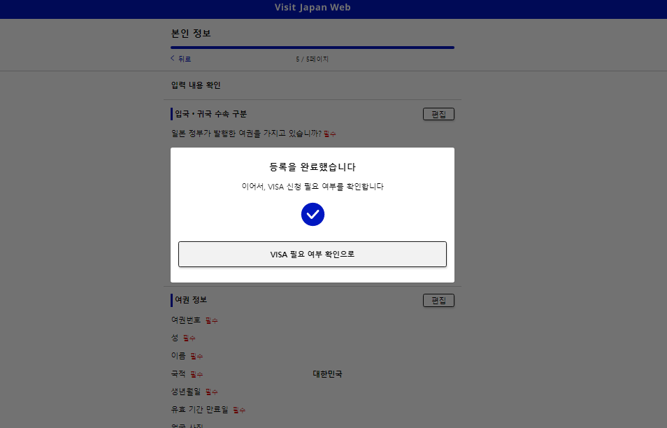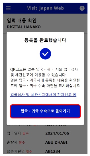 √ 등록을 완료했습니다라는 팝업창이 뜨면 입국. 귀국 수속으로 돌아가기 클릭 ↓ ↓