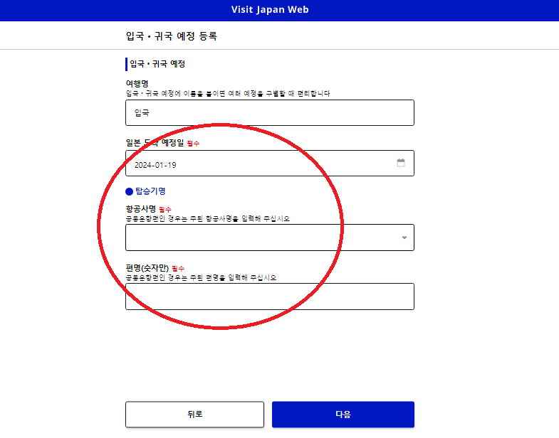 √ 일본도착예정일. 탑승기명 항공사명. 편명 입력 ↓ ↓
