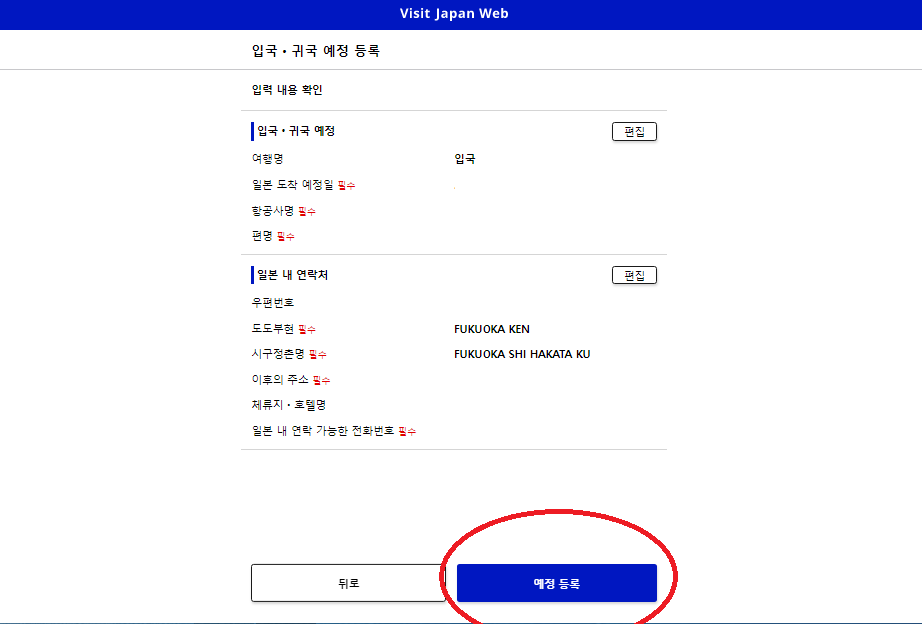 일본 내 연락처(체류지) 입력 :  호텔에서 묵을 경우는 호텔 주소와 전화번호를 입력하면 됩니다. ↓ ↓