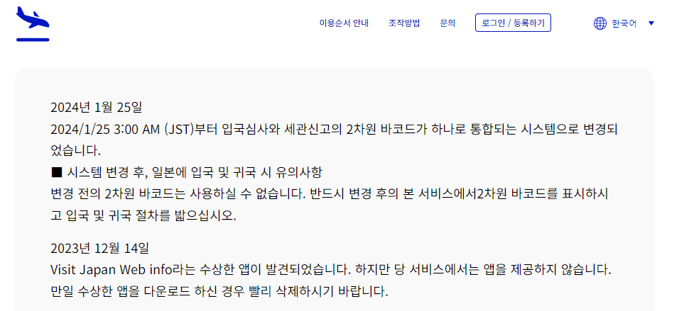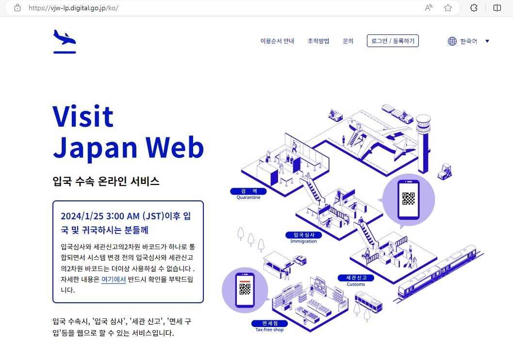 웹사이트를 통해 출국 전 미리 입국심사정보를 등록하면 비행기에서 승무원들이 나눠주는 입국 서류를 따로 작성하지 않아도 되고 큐알 코드로 입국할 수 있습니다.